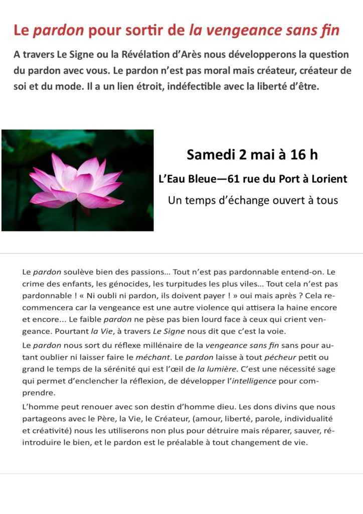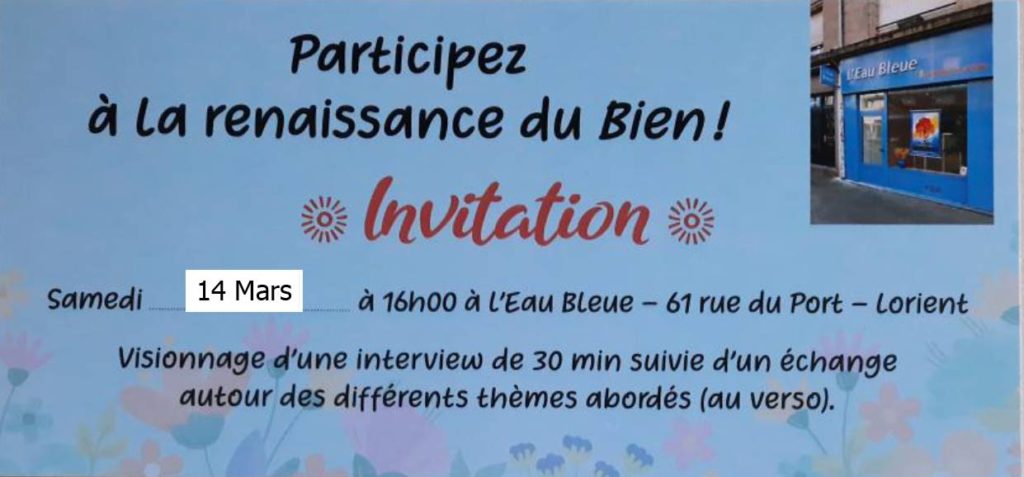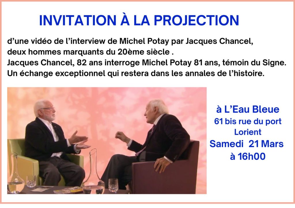 Situé au centre ville de Lorient « L’Eau Bleue » est un espace d’information et d’accueil pour faire connaître “Le Signe“. Ce livre contient les messages que Michel Potay reçut de Jésus apparu en 1974 et du Créateur Lui-même en 1977, à Arès (Gironde, France).